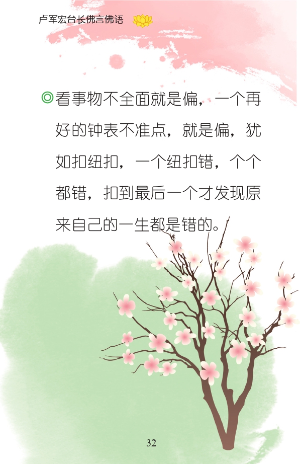 不限会员 看事物不全面就是偏,一个再好的钟表不准点,就是偏,犹如扣纽扣,一个纽扣错,个个都错,扣到最后一个才发现原来自己的一生都是错的。|佛言佛语第一册