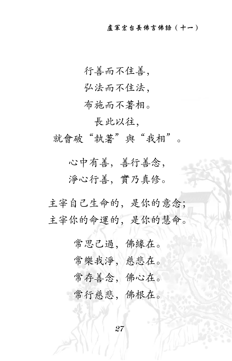 不限会员 行善而不住善, 弘法而不住法, 布施而不着相。 长此以往, 就会破“执着”与“我相”。 心中有善,善行善念, 净心行善,实乃真修。 主宰自己生命的,是你的意念; 主宰你的命运的,是你的慧命。 常思己过,佛缘在。 常乐我净,慈悲在。 常存善念,佛心在。 常行慈悲,佛根在。 |佛言佛语(十一)