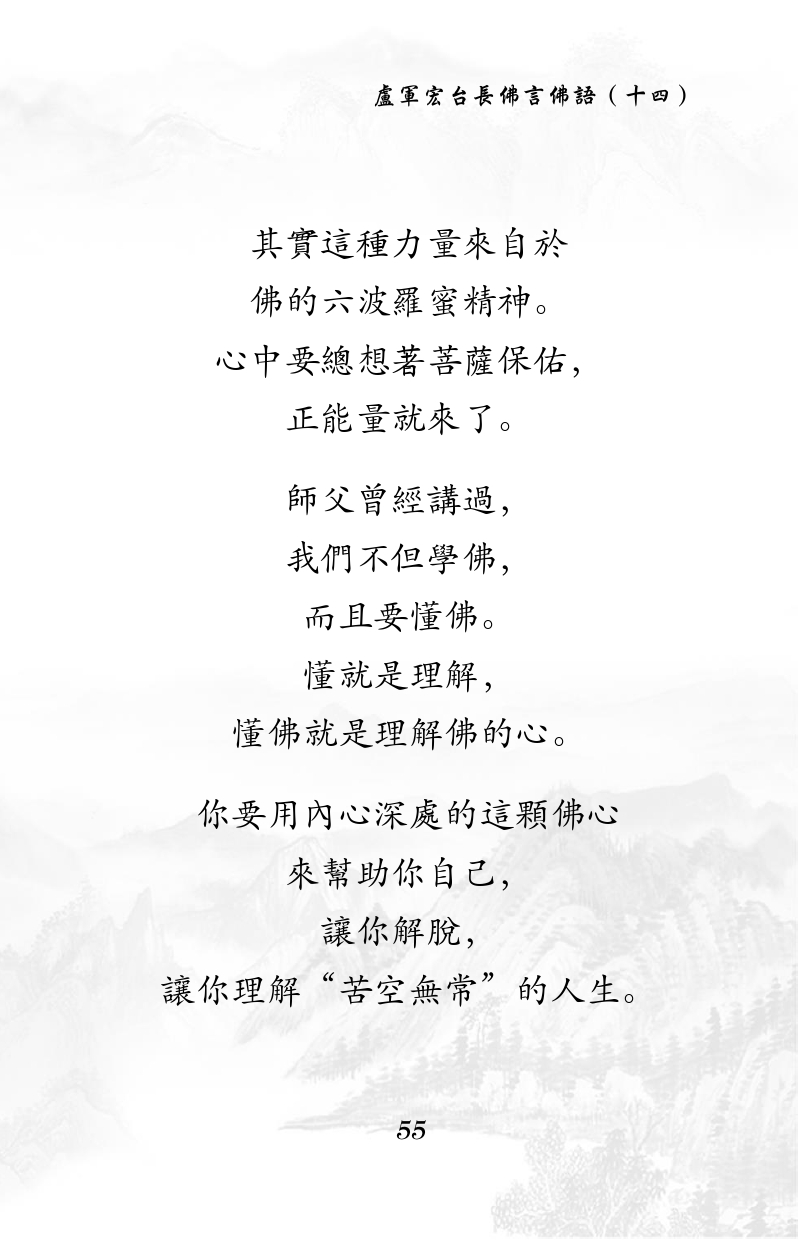 不限会员 其實這種力量來自於 佛的六波羅蜜精神。 心中要總想著菩薩保佑, 正能量就來了。 師父曾經講過, 我們不但學佛, 而且要懂佛。 懂就是理解, 懂佛就是理解佛的心。 你要用內心深處的這顆佛心 來幫助你自己, 讓你解脫, 讓你理解“苦空無常”的人生。 |佛言佛语(十四)