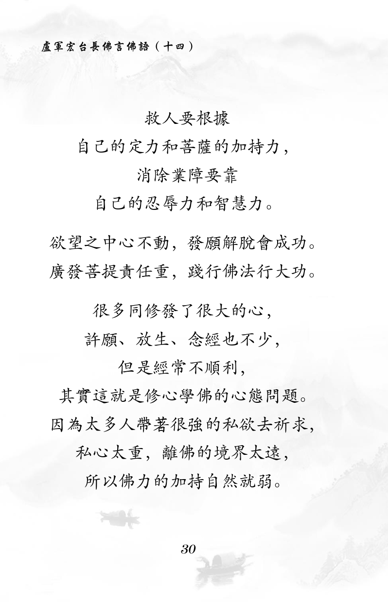 不限会员 救人要根據 自己的定力和菩薩的加持力, 消除業障要靠 自己的忍辱力和智慧力。 欲望之中心不動,發願解脫會成功。 廣發菩提責任重,踐行佛法行大功。 很多同修發了很大的心, 許願、放生、念經也不少, 但是經常不順利, 其實這就是修心學佛的心態問題。 因為太多人帶著很強的私欲去祈求, 私心太重,離佛的境界太遠, 所以佛力的加持自然就弱。 |佛言佛语(十四)