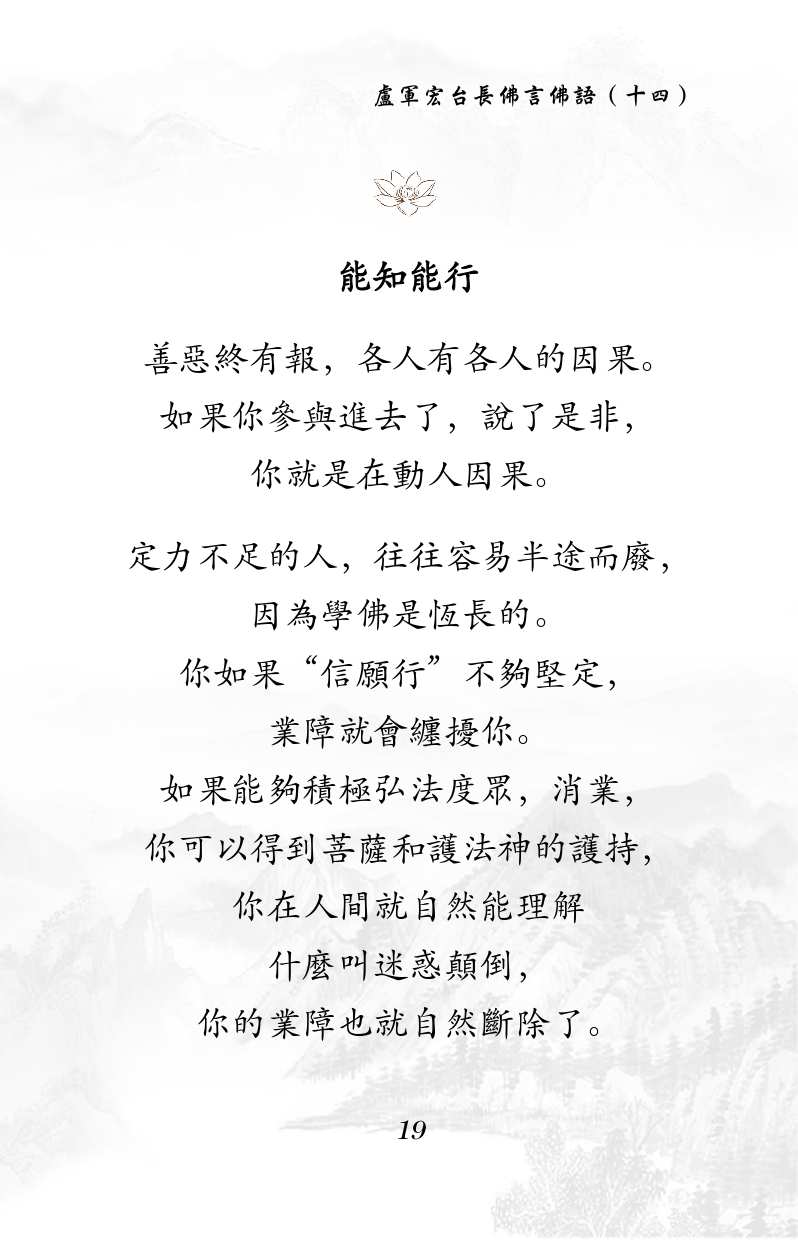 不限会员 能知能行 善惡終有報,各人有各人的因果。 如果你參與進去了,說了是非, 你就是在動人因果。 定力不足的人,往往容易半途而廢, 因為學佛是恆長的。 你如果“信願行”不夠堅定, 業障就會纏擾你。 如果能夠積極弘法度眾,消業, 你可以得到菩薩和護法神的護持, 你在人間就自然能理解 什麼叫迷惑顛倒, 你的業障也就自然斷除了。 |佛言佛语(十四)