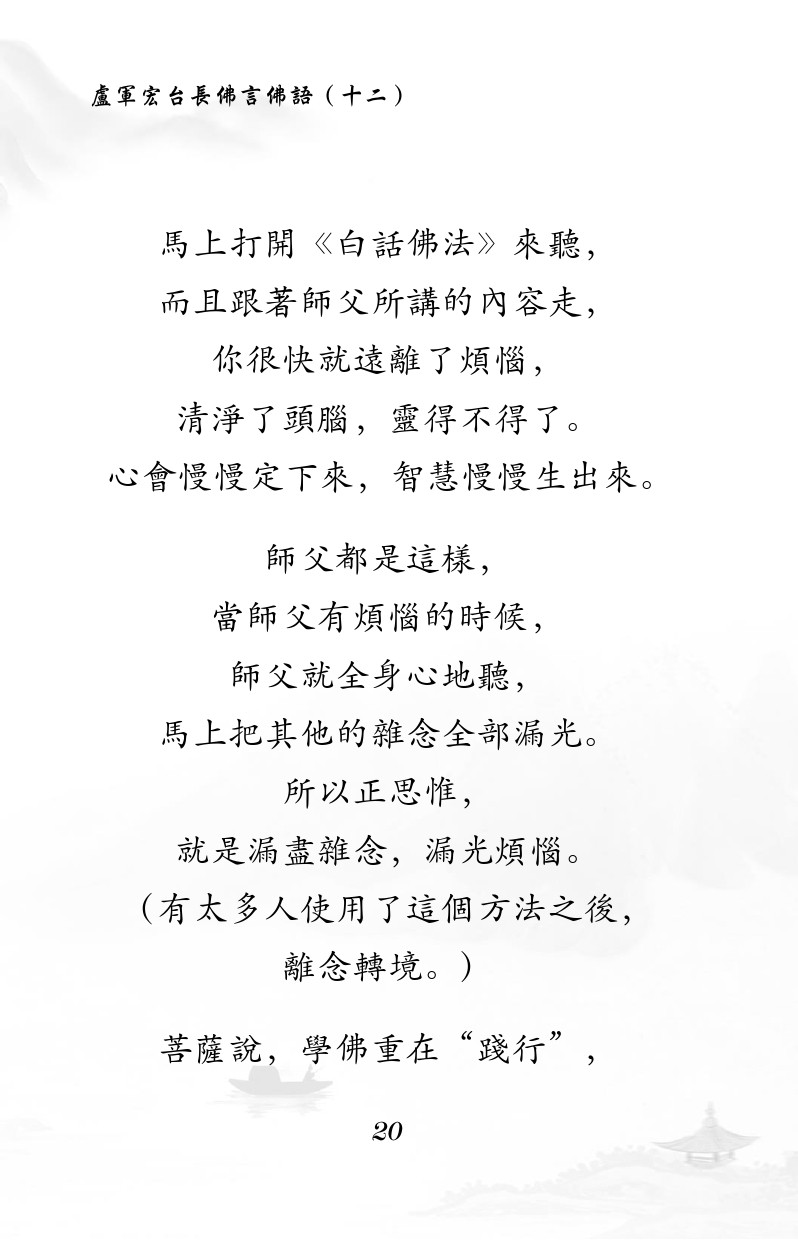 不限会员 马上打开《白话佛法》来听, 而且跟着师父所讲的内容走, 你很快就远离了烦恼, 清净了头脑,灵得不得了。 心会慢慢定下来,智慧慢慢生出来。 师父都是这样, 当师父有烦恼的时候, 师父就全身心地听, 马上把其他的杂念全部漏光。 所以正思惟, 就是漏尽杂念,漏光烦恼。 (有太多人使用了这个方法之后, 离念转境。) 菩萨说,学佛重在“践行”, |佛言佛语(十二)