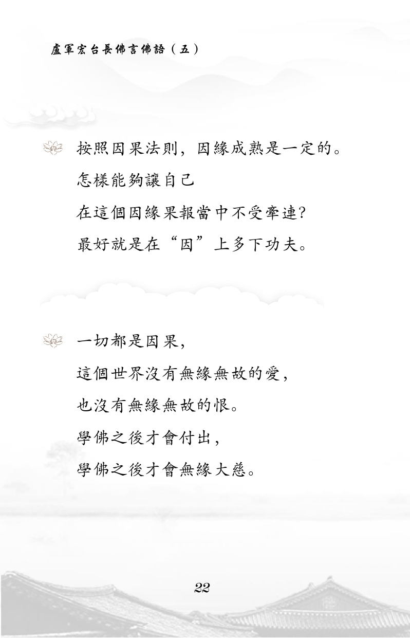 不限会员 按照因果法则,因缘成熟是一定的。 怎样能够让自己 在这个因缘果报当中不受牵连? 最好就是在“因”上多下功夫。 一切都是因果, 这个世界没有无缘无故的爱, 也没有无缘无故的恨。 学佛之后才会付出, 学佛之后才会无缘大慈。 |佛言佛语 第五册