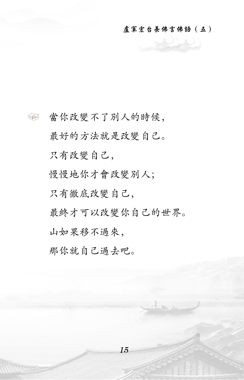 不限会员 当你改变不了别人的时候, 最好的方法就是改变自己。 只有改变自己, 慢慢地你才会改变别人; 只有彻底改变自己, 最终才可以改变你自己的世界。 山如果移不过来, 那你就自己过去吧。 |佛言佛语 第五册
